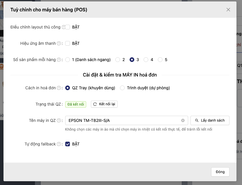 3. Kiểm tra kết nối và chọn máy in từ POS