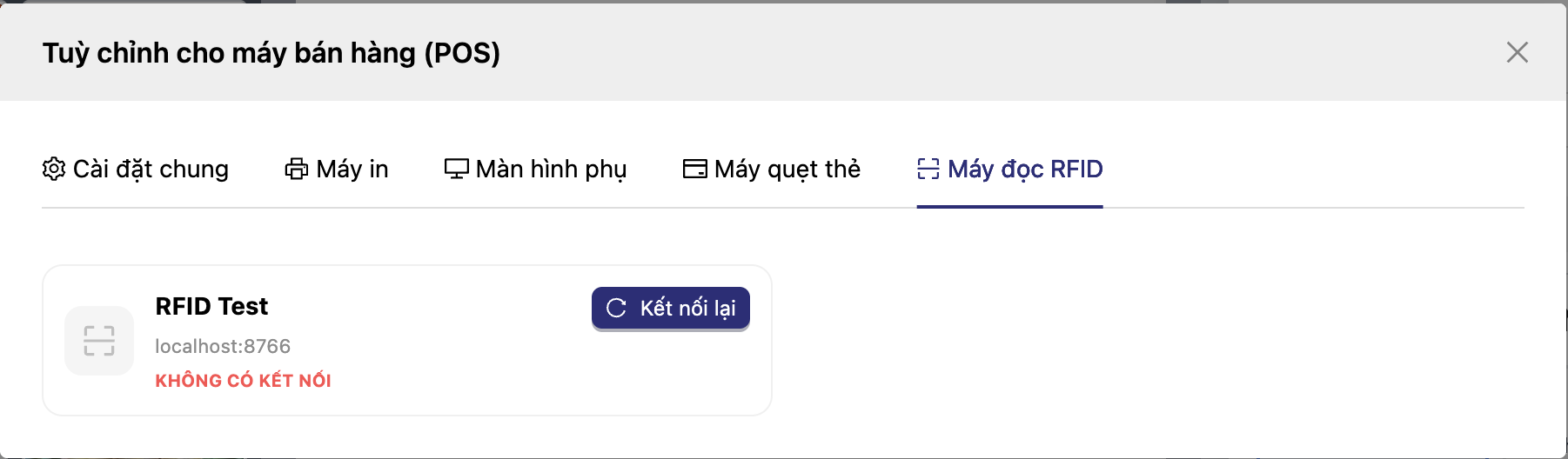 Host và Port: Thông tin Host và Port phải chính xác để POS có thể kết nối tới máy đọc RFID. Nếu không chắc chắn, vui lòng tham khảo tài liệu của nhà sản xuất.