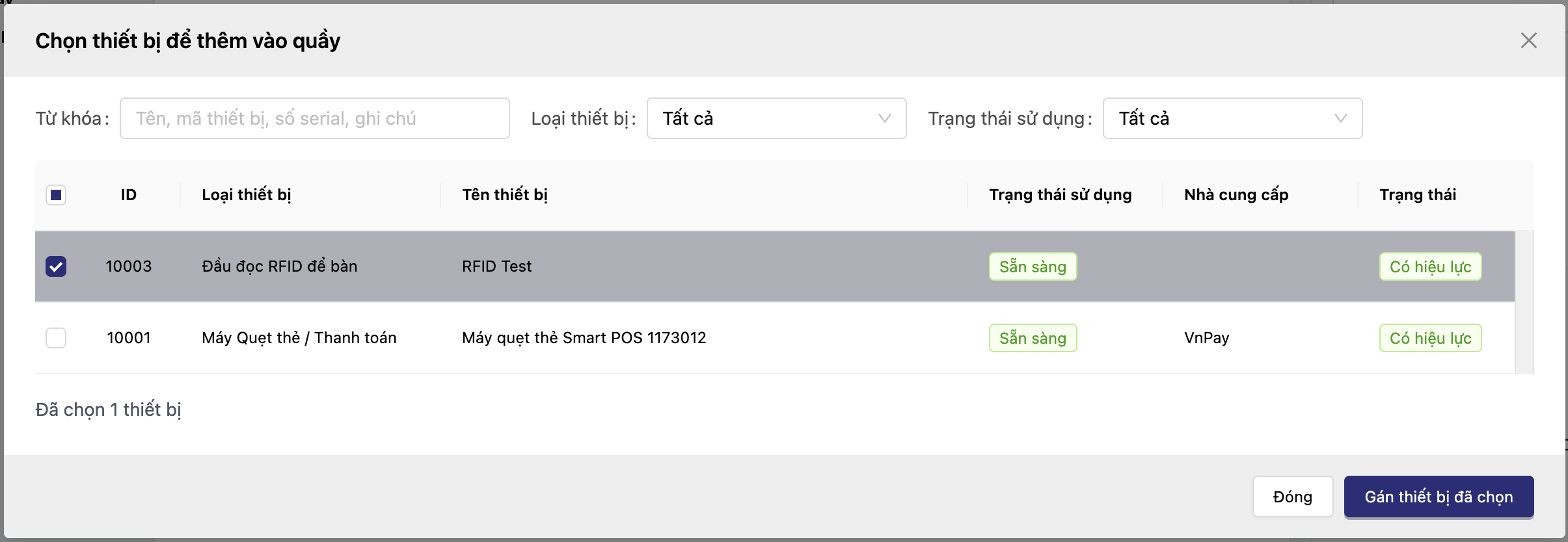 - Bạn sẽ thấy danh sách các thiết bị máy đọc RFID đã được gán vào quầy.