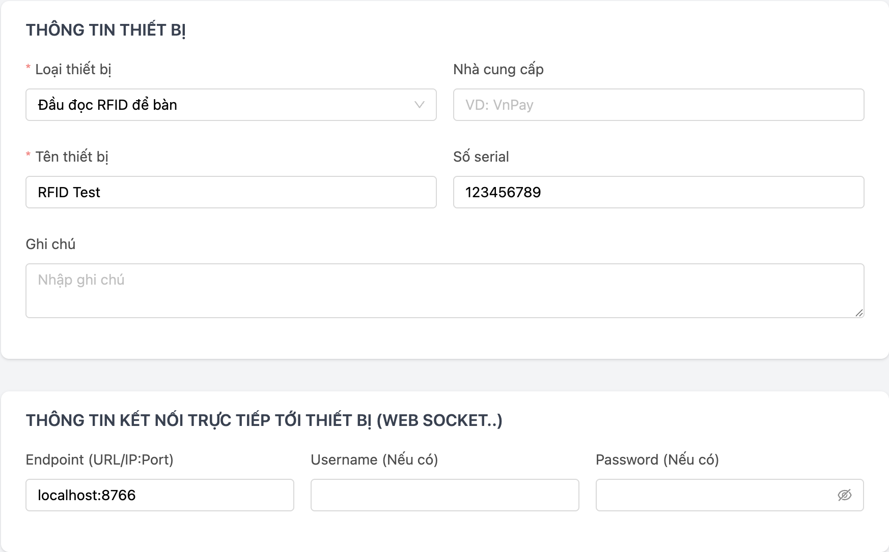 - Port: Cổng kết nối WebSocket của máy đọc RFID. Mặc định là 8766. Nếu máy đọc RFID của bạn sử dụng port khác, hãy nhập port đó.