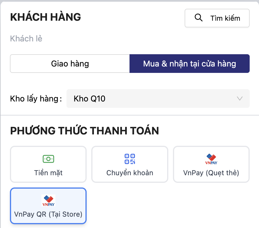 - Ở màn hình POS, bạn sẽ thấy phương thức thanh toán VnPay QR trong danh sách phương thức thanh toán.