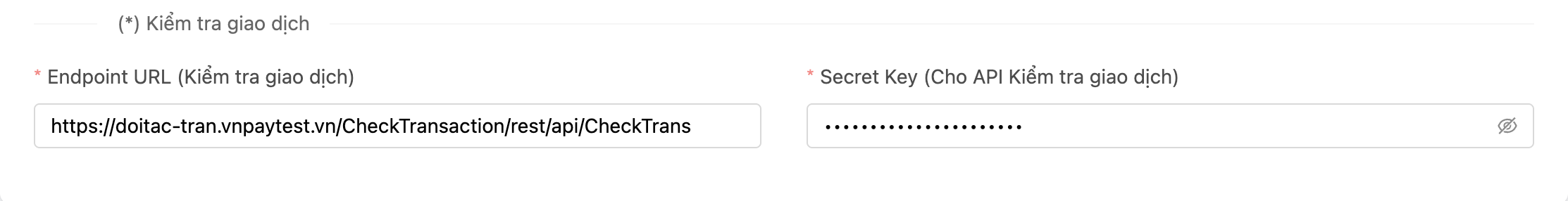 | Endpoint URL (Kiểm tra giao dịch) | Địa chỉ API để kiểm tra trạng thái giao dịch. | Có |
