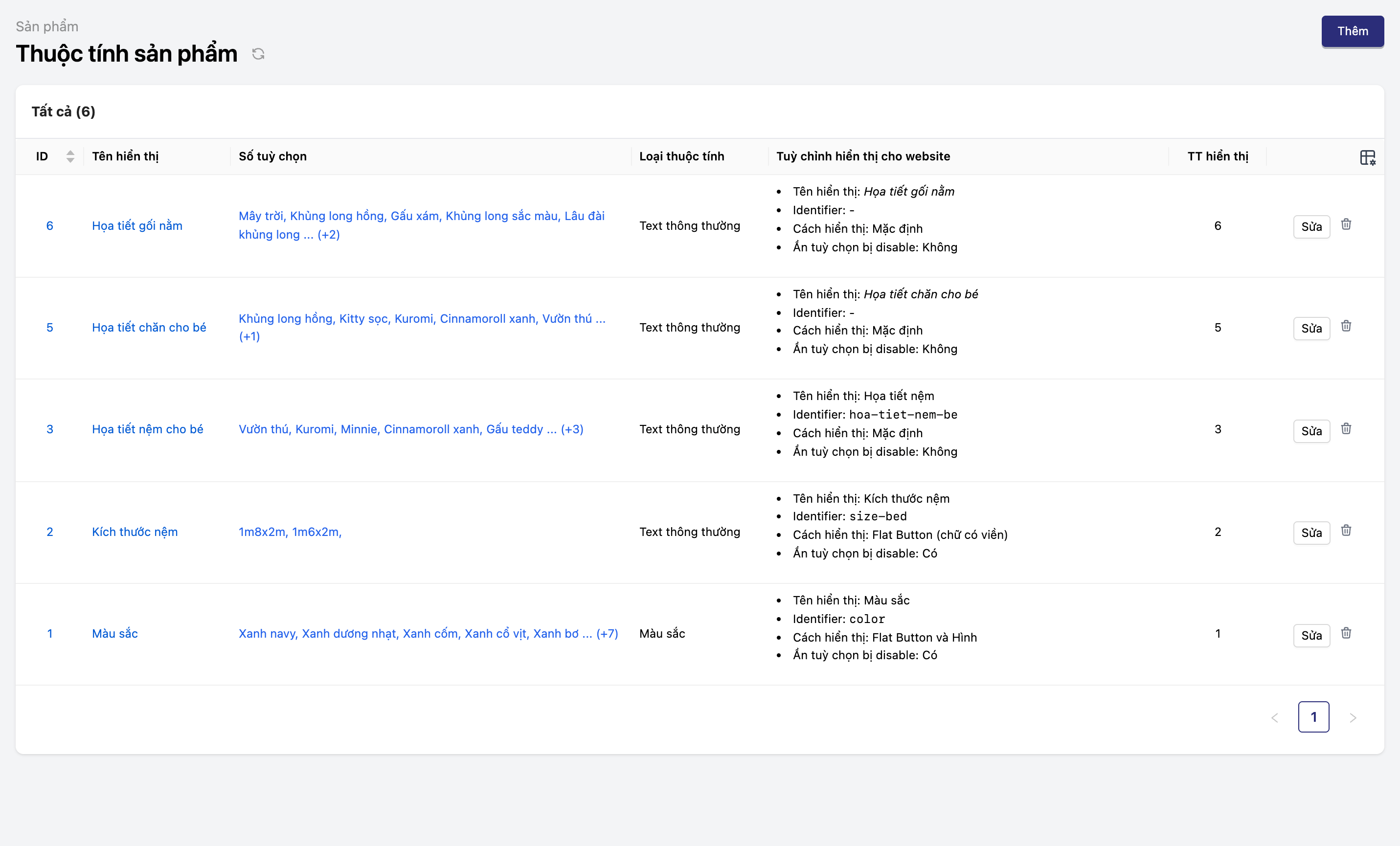 - Màn hình danh sách hiển thị dạng bảng với các cột: ID, Tên hiển thị, Số tuỳ chọn, Loại thuộc tính, Tùy chỉnh hiển thị cho website, TT hiển thị.